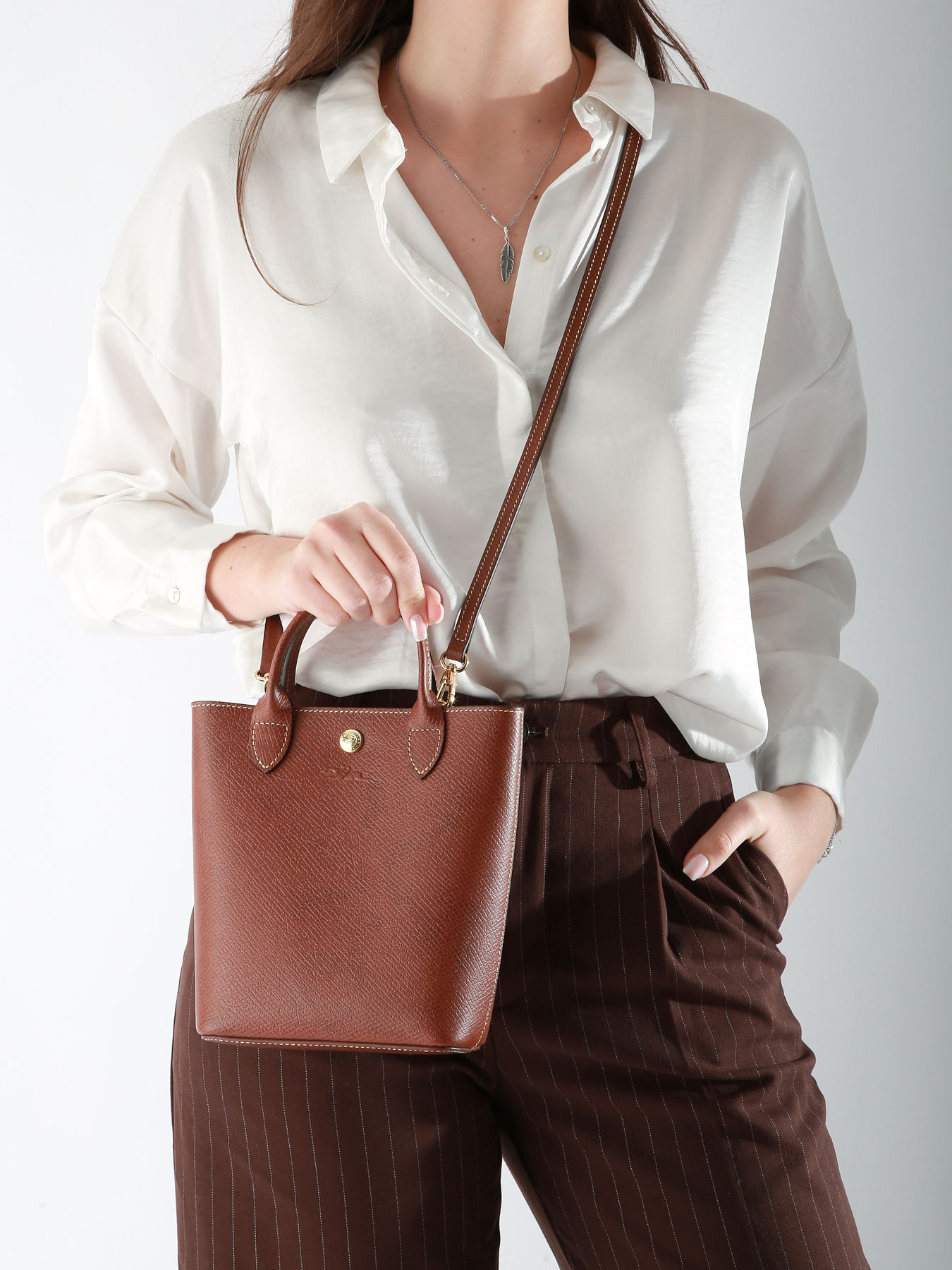 Deze schoudertas van LONGCHAMP in rundsleer belichaamt minimalistische elegantie en vakmanschap. Het is voorzien van een drukknoopsluiting, een handgreep van 7 cm en een verstelbare, afneembare schouderriem, wat uitzonderlijke veelzijdigheid biedt en het mogelijk maakt om de tas in de hand, op de schouder of crossbody te dragen. Het verfijnde Russische leer en de strakke lijnen benadrukken een tijdloos en sophisticated ontwerp, geaccentueerd door een signature drukknoop. Aan de binnenkant biedt een ruim compartiment en een eenvoudig vak ruimte voor je dagelijkse benodigdheden, zoals een pocketboek of persoonlijke accessoires. Geïnspireerd door een optimistische en elegante visie op het dagelijks leven, combineert deze tas gestructureerde, grafische lijnen met perfecte functionaliteit, en past zich moeiteloos aan elke stijl en gelegenheid aan. Perfect om je dagen te vergezellen, is het een onmiskenbare, chique en praktische must-have.