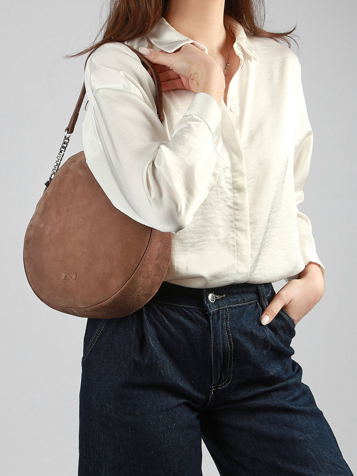 De elegante Anna schoudertas van Nathan Baume werd speciaal voor dit seizoen vervaardigd uit een soepel suède rundsleer. Zacht en uiterst aangenaam in aanraking! Het iconische N-logo van het merk werd vooraan in het leder gedrukt. Deze damestas beschikt over een kort afneembaar schouderriempje met schakels, en een langere schouderriem om gekruist of lang over de schouder te dragen. Deze ronde schoudertas sluit met rits, en onthult een mediumgroot interieur met handige rits- en steekvakjes. Er is ook een koordje met musketonsluiting voorzien, waar u uw sleutels aan kunt bevestigen. De perfecte tas voor dagelijks gebruik, waar u uw spulletjes overzichtelijk in kunt opbergen!